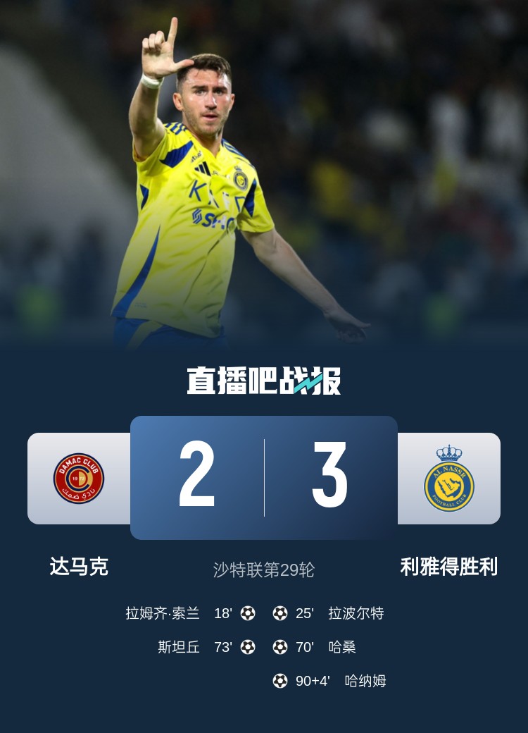 沙特聯(lián)第29輪,利雅得勝利客場3-2逆轉達馬克。上半場,索蘭先拔頭籌,拉波爾特扳平比分;下半場,哈桑替補反超,斯坦丘3分鐘追平,哈納姆補時94分鐘絕殺。