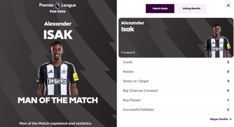 賽后,英超官方宣布,本場(chǎng)比賽中打進(jìn)2球的伊薩克當(dāng)選全場(chǎng)最佳球員。