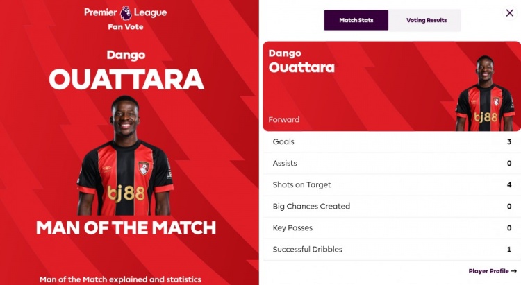本場比賽瓦塔拉上演帽子戲法,全場4次射正,還有1次過人,賽后他也當選英超官方評選出的本場最佳球員。