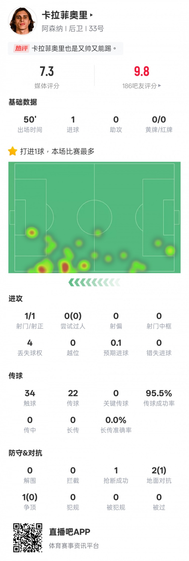 1月26日訊 英超第23輪,阿森納客戰(zhàn)狼隊,卡拉菲奧里替補(bǔ)出戰(zhàn),打進(jìn)制勝進(jìn)球,傳球成功率達(dá)到95.5%,評分7.3。卡拉菲奧里本場數(shù)據(jù):進(jìn)球1助攻0射門1射正1丟失球權(quán)4觸球34傳球22傳球成功率95.5%搶斷1地面對抗2地面對抗成功1爭頂1爭頂成功0 本文標(biāo)簽: 足球 英超 阿森納