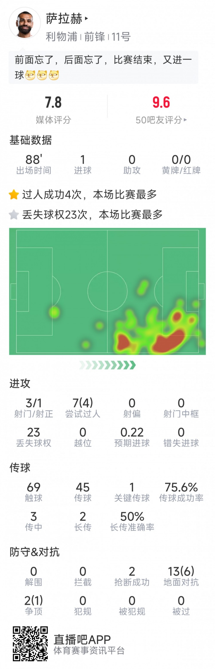 1月26日訊 在本輪英超,利物浦4-1大勝伊普斯維奇。薩拉赫本場(chǎng)打進(jìn)一球,以下為他在本場(chǎng)數(shù)據(jù):