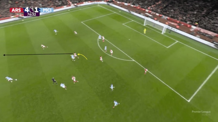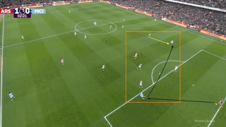 首先,球隊(duì)嚴(yán)格執(zhí)行了阿爾特塔前場(chǎng)高壓的戰(zhàn)術(shù),開(kāi)場(chǎng)2分鐘的進(jìn)球就是源于前場(chǎng)的局部4打3,從結(jié)果來(lái)看球隊(duì)的戰(zhàn)術(shù)效果非常出色。哈弗茨隨后錯(cuò)失單刀的機(jī)會(huì)也是球隊(duì)力拼下來(lái)的,可惜沒(méi)能形成進(jìn)球。托馬斯下半場(chǎng)的進(jìn)球同樣源自高位攔截,他的破門是從福登的傳球攔下的。