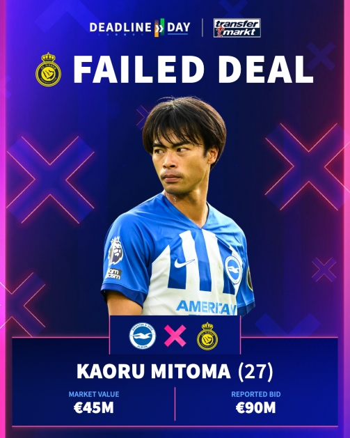 球員身價4500萬歐,勝利報價6500萬歐,后加價至9000萬歐,遭布萊頓拒絕。