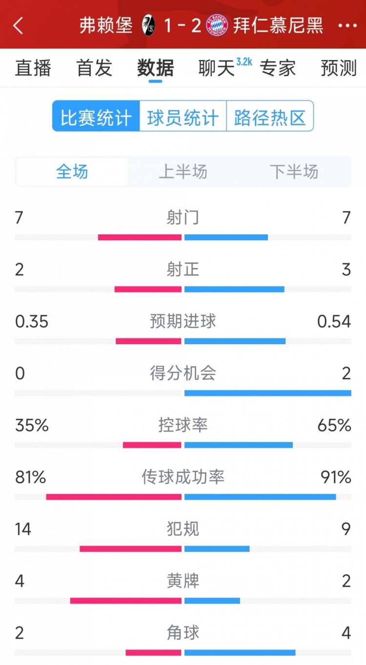 1月26日訊 在本輪德甲,拜仁2-1擊敗弗賴(lài)堡。以下為雙方全場(chǎng)數(shù)據(jù)對(duì)比: