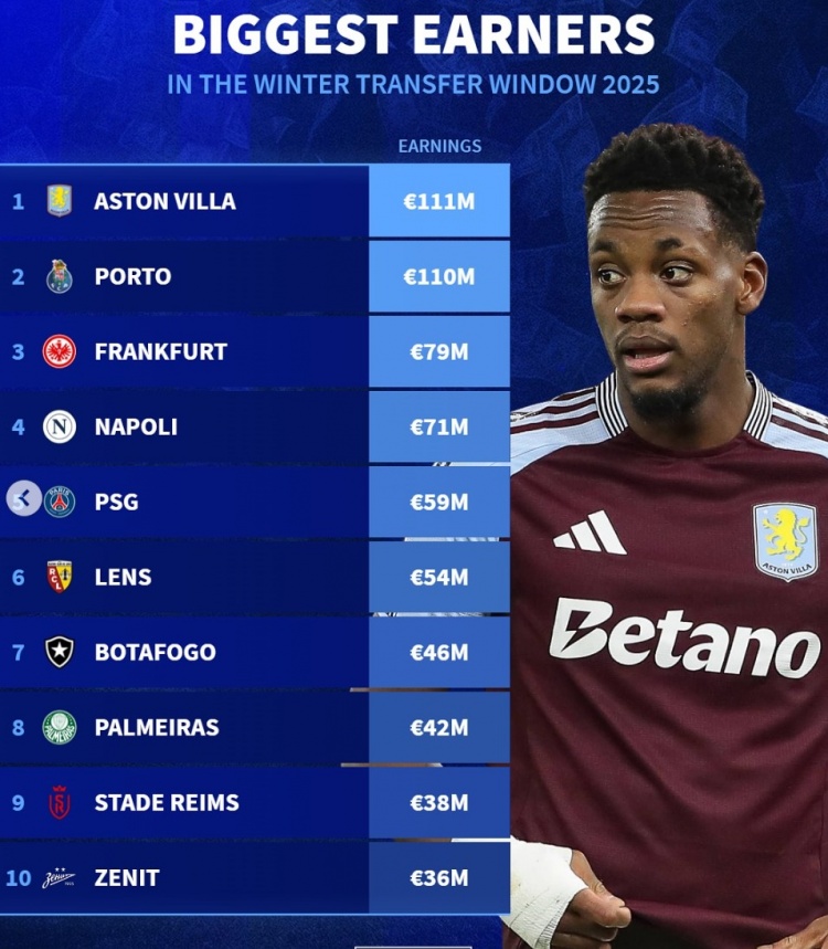 2月5日訊 五大聯(lián)賽已經(jīng)關(guān)窗,《轉(zhuǎn)會(huì)市場》也統(tǒng)計(jì)了今年冬窗各隊(duì)收入情況,維拉力壓波爾圖居首。