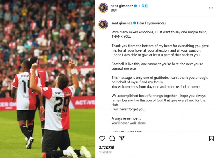 “一如既往,你永遠(yuǎn)不會獨行。再見費耶諾德,我會把你們永遠(yuǎn)珍藏在心。愛你們的,圣地亞哥。”