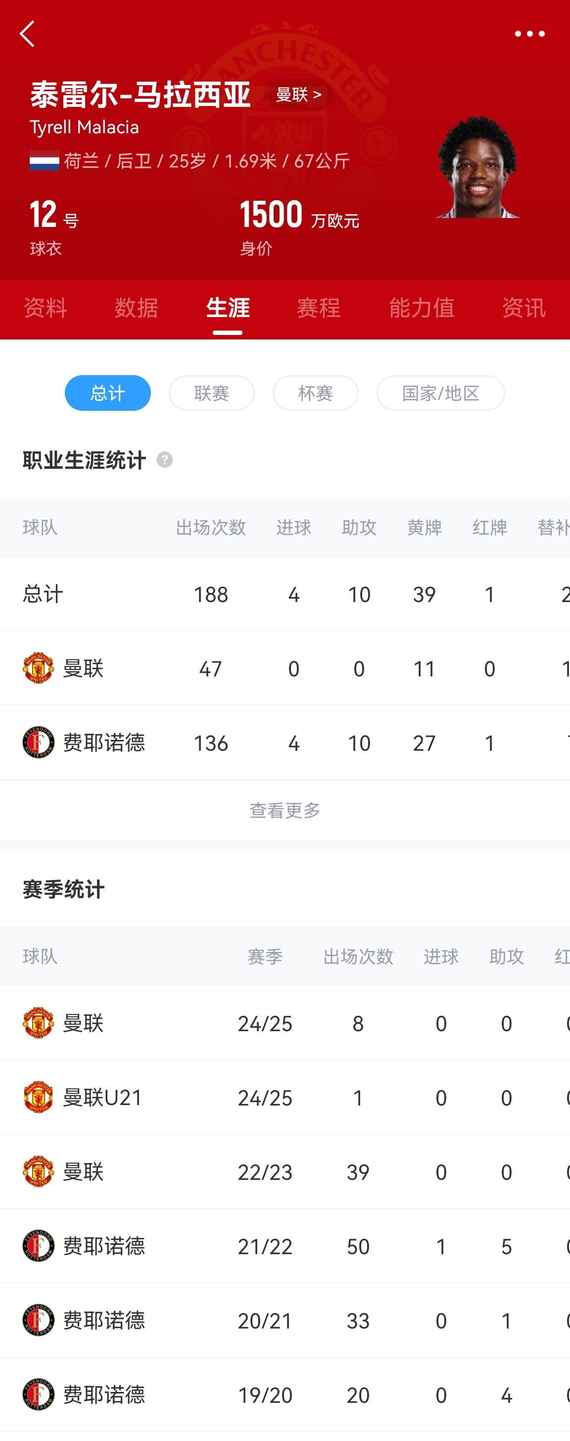 馬拉西亞是滕哈赫?qǐng)?zhí)教期間1500萬(wàn)歐元從費(fèi)耶諾德簽下的,但加盟以后受傷病和適應(yīng)問(wèn)題的困擾,2年半總共只為曼聯(lián)出場(chǎng)47次。