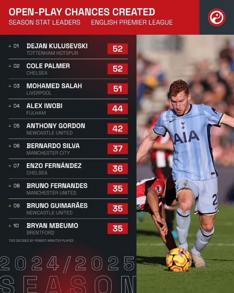 本賽季英超運動戰(zhàn)創(chuàng)造機(jī)會榜: