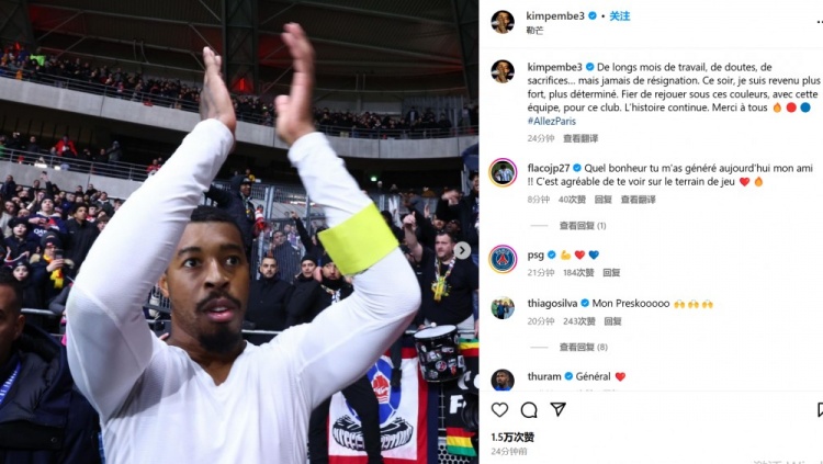 2月5日訊 巴黎在本輪法國(guó)杯2-0擊敗勒芒,29歲的中衛(wèi)金彭貝時(shí)隔2年終于復(fù)出。