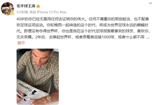 王濤寫道:“40歲的你已經(jīng)無需用任何去證明你的偉大。任何不尊重你的那些蛀蟲,也不配喜歡足球這項運動。你和梅西一起締造的這個時代,將成為世界足球永遠(yuǎn)的巔峰時代。即便沒有奪得世界杯,你也是我在這個時代足球?qū)用孀钕矚g的球員,喜歡你,無關(guān)榮耀。2年后,去捧起世界杯,或者昂著首迎接1000球,或者什么都不用爭取,因為你足夠偉大了。祝你生日快樂!”