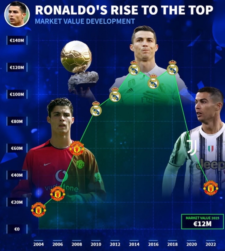 他加盟尤文后身價逐漸下滑到6000萬歐,重返曼聯(lián)后僅為3000萬歐,而當(dāng)前效力于利雅得勝利為1200萬歐。