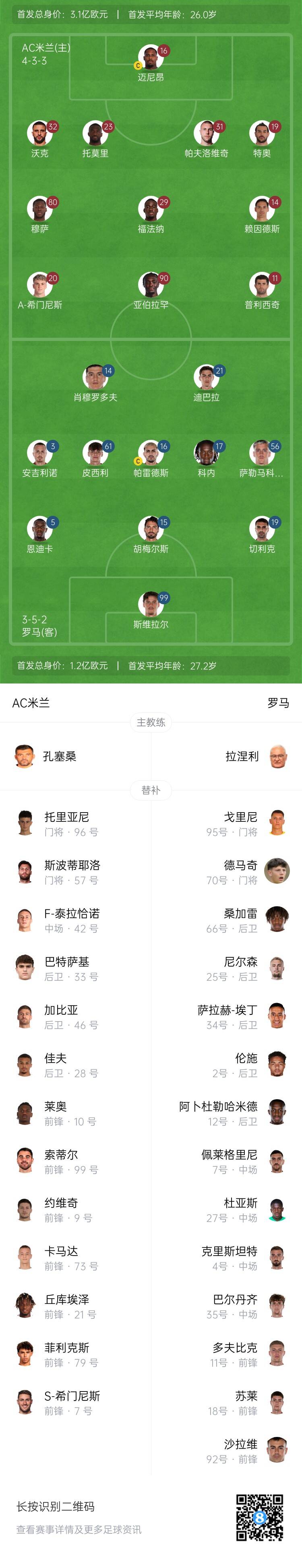 2月6日訊 意杯1/4決賽,AC米蘭對陣羅馬。賽前,官方公布了本場的首發(fā)名單。