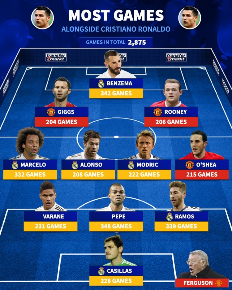 和C羅一起出場次數(shù)最多的陣容↓