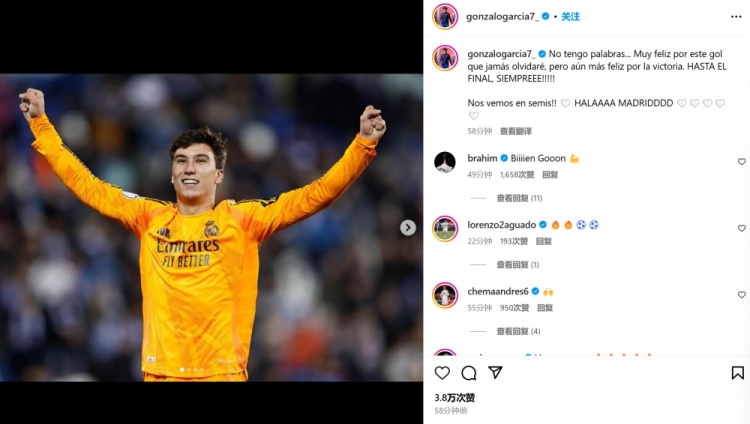 2月6日訊 皇馬在本輪國王杯3-2絕殺萊加內(nèi)斯,小將貢薩洛-加西亞替補打進絕殺。第90+3分鐘,迪亞斯傳中,小將貢薩洛-加西亞頭球破門打進皇馬一線隊處子球。他也在賽后通過社媒曬出自己的慶祝照,并配文:“我高興到不知道該說什么了……我很高興能夠打進這粒永遠不會忘記的進球,但更高興的是取得勝利。永遠要戰(zhàn)斗到最后一刻!半決賽見!馬德里前進!” 本文標(biāo)簽: 足球 西甲 皇家馬德里 萊加內(nèi)斯