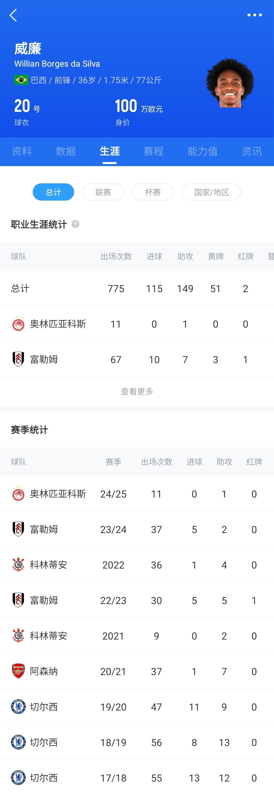 36歲的威廉生涯曾效力切爾西、阿森納等隊(duì),他曾于2022-2024效力富勒姆,共為富勒姆出場(chǎng)67次打入10球7助攻。