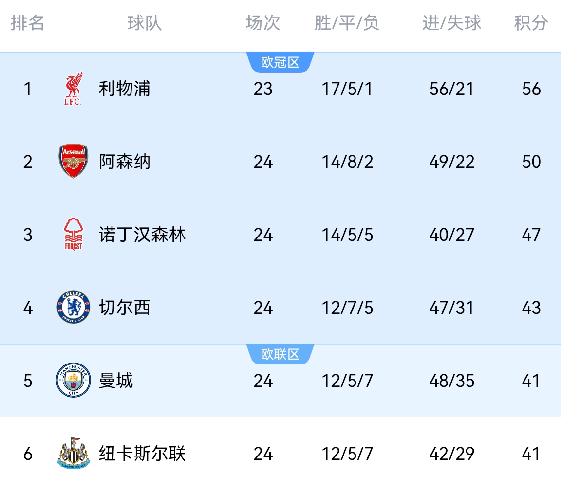 英超,24輪過后落后少賽一場的利物浦6分排名第二