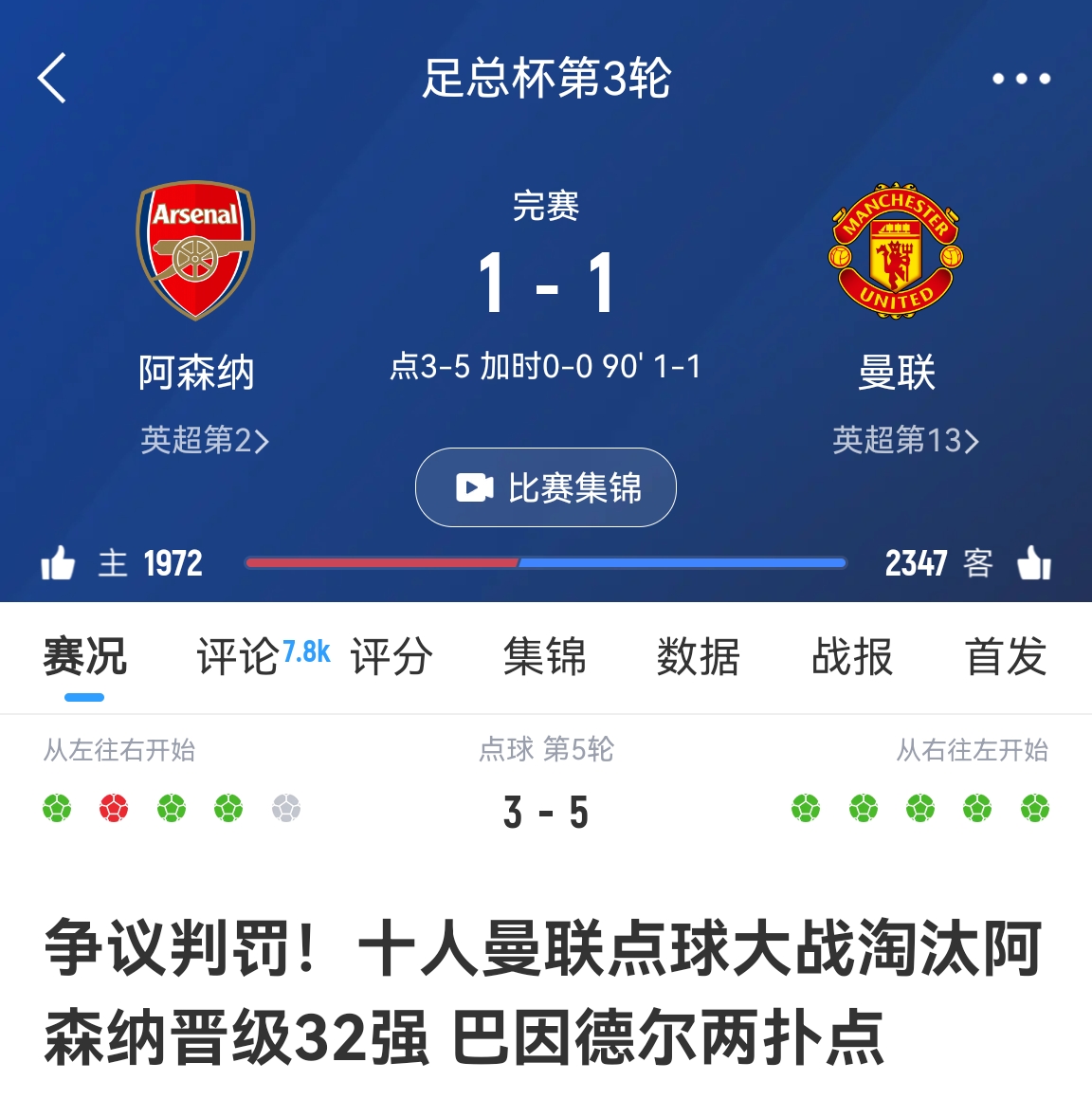足總杯,1/32決賽點(diǎn)球3-5總分4-6不敵曼聯(lián)