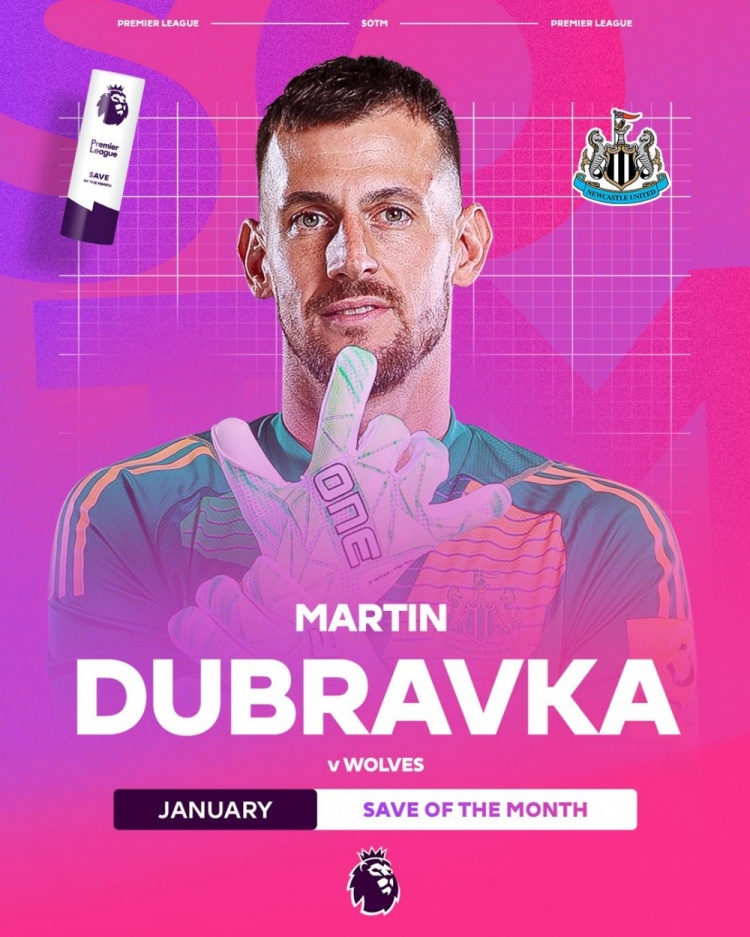 2月7日訊 英超官方公布了1月最佳撲救,獲獎的是紐卡門將杜布拉夫卡。