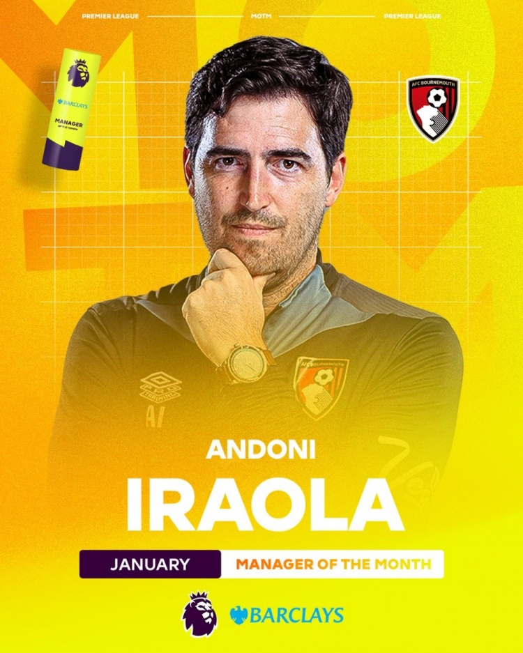 2月7日訊 英超官方宣布,伯恩茅斯主帥安多尼-伊勞拉當(dāng)選英超1月最佳教練。