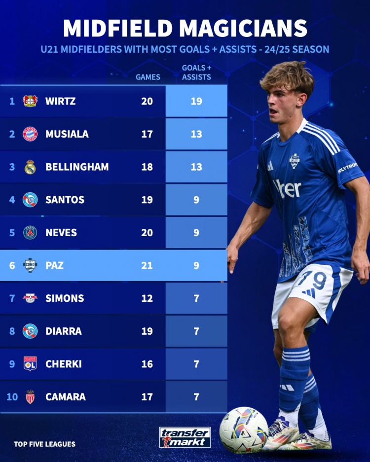 2月7日訊 德國轉會市場統(tǒng)計了本賽季五大聯(lián)賽U21中場參與進球的數(shù)量,并列出榜單,維爾茨參與19球居首,尼科-帕斯參與9球排名并列第4位。