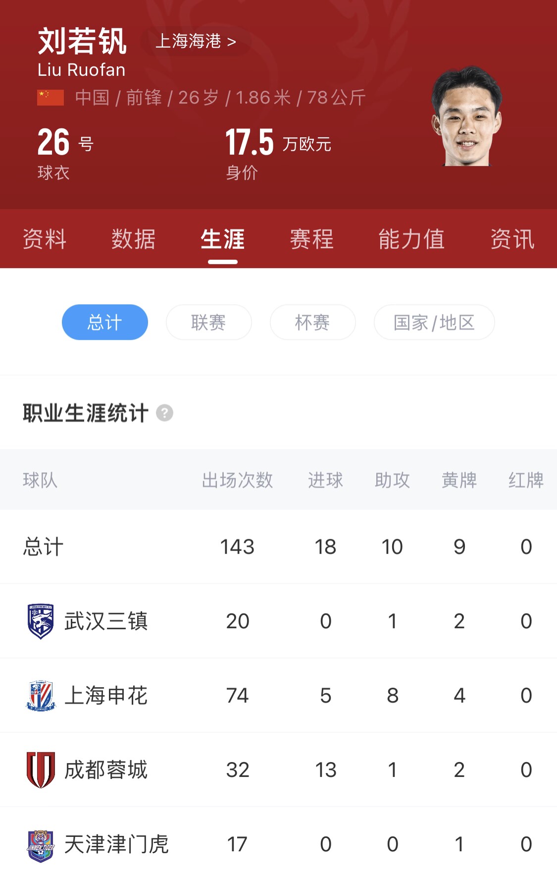 現(xiàn)年26歲的劉若釩,司職中鋒、邊鋒、邊前衛(wèi),出身根寶基地轉投上海申花后,2017年完成首秀。