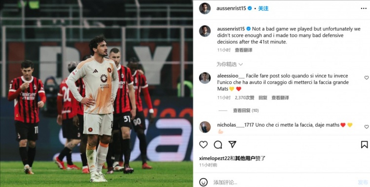 2月7日訊 不久前,羅馬后衛(wèi)胡梅爾斯更新了社交媒體,總結(jié)了球隊輸給米蘭的問題。在此前結(jié)束的意大利杯1/4決賽中,羅馬客場1-3不敵米蘭遭到了淘汰。胡梅爾斯在社交媒體上寫道:“我們踢得還不錯,但不幸的是進(jìn)球不夠多。而且41分鐘后,我在防守上做出了太多錯誤的決定?!?/p> 本文標(biāo)簽: 足球 意甲 羅馬