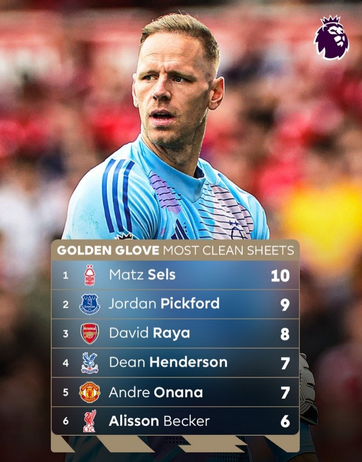 2月8日訊 英超官方盤點(diǎn)了本賽季門將零封場(chǎng)次榜,其中諾丁漢森林門將塞爾斯10場(chǎng)居首,以下為具體榜單: