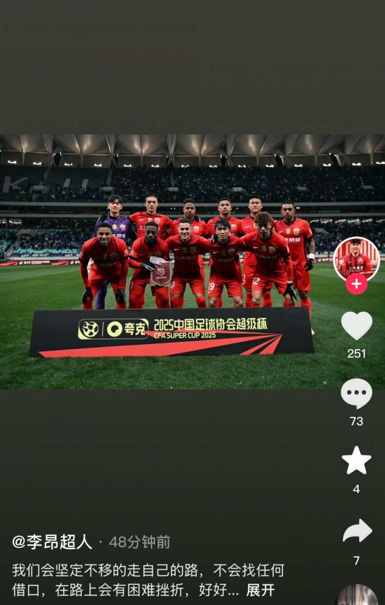 2月8日訊 今天,海港中衛(wèi)李昂更新社媒,為自己和海港隊友們送上了鼓勵。昨晚進行的超級杯比賽中,海港2-3遭申花逆轉(zhuǎn),無緣超級杯冠軍。本場比賽,李昂代表海港首發(fā)并打滿了全場。無緣超級杯冠軍后,李昂更新社媒寫道:“我們會堅定不移的走自己的路,不會找任何借口,在路上會有困難挫折,好好總結(jié),我們一起努力!” 本文標簽: 足球 中超 中國足球 上海海港