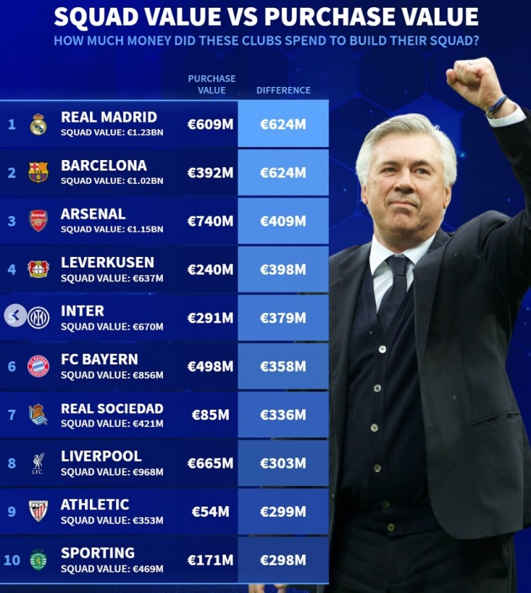 2月8日訊 《轉(zhuǎn)會市場》統(tǒng)計(jì)了當(dāng)前陣容身價(jià)高于引進(jìn)費(fèi)用情況,皇馬巴薩并列居首。