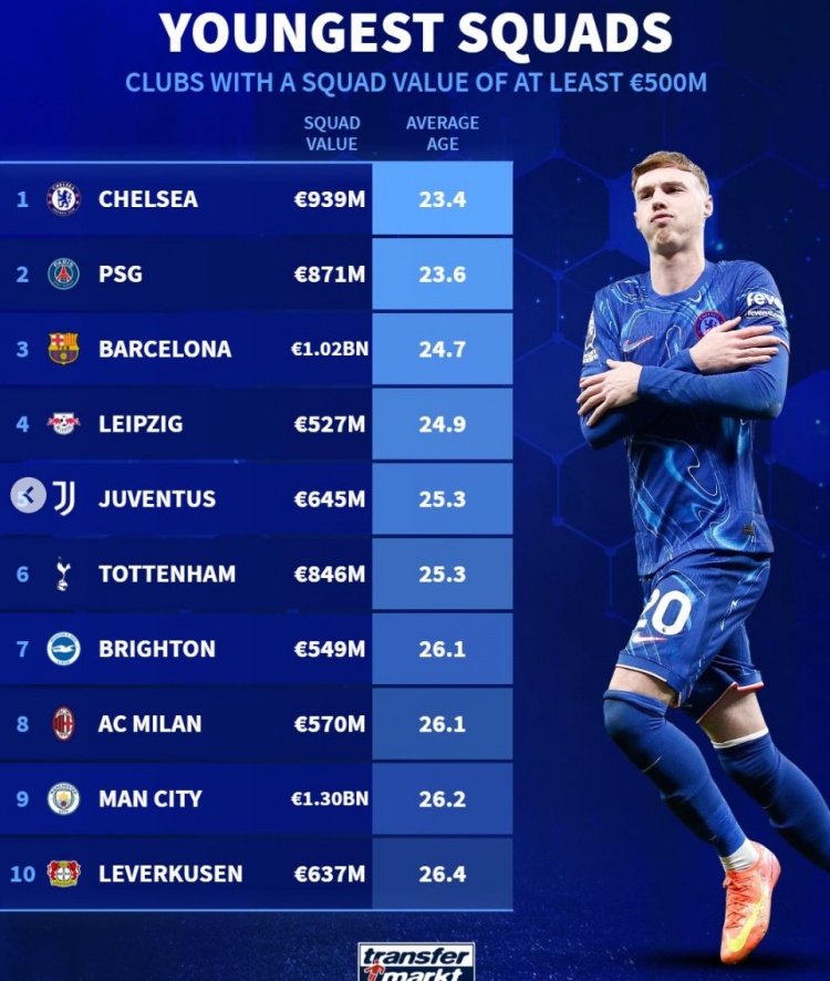 2月9日訊 《轉(zhuǎn)會(huì)市場(chǎng)》統(tǒng)計(jì)了身價(jià)超過5億歐元的球隊(duì)當(dāng)前陣容平均年齡最年輕榜單,切爾西居首。