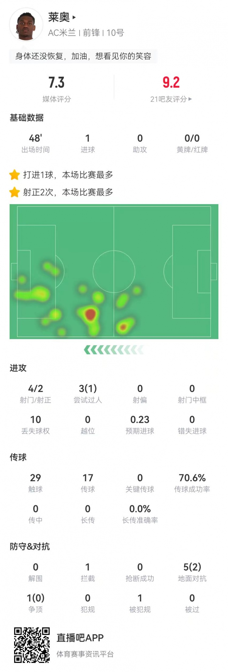 萊奧本場替補(bǔ)4射2正進(jìn)1球 7對抗2成功+2造犯規(guī) 獲評7.3分