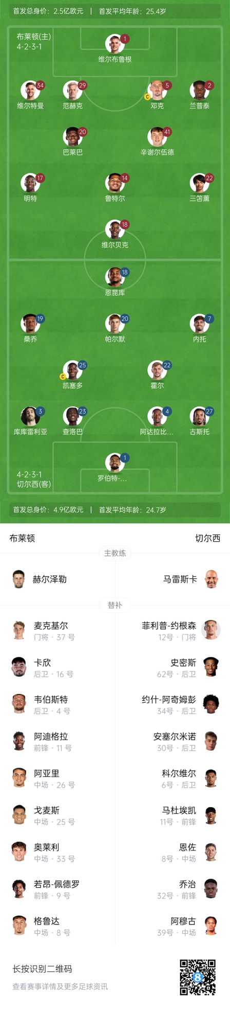 布萊頓替補:37-麥克基爾、4-韋伯斯特、25-戈麥斯、33-奧萊利、26-阿亞里、8-格魯達(dá)、9-若昂-佩德羅、11-阿迪格拉、16-卡辛