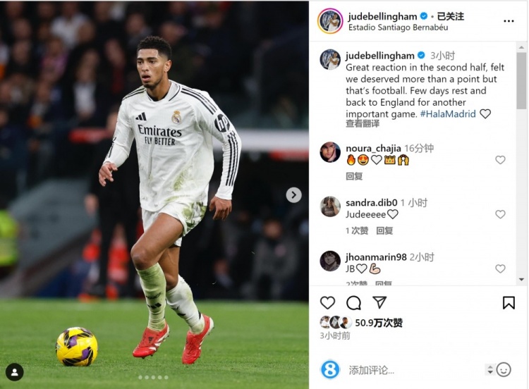 貝林厄姆曬出自己的比賽照片,配文:“球隊(duì)下半場(chǎng)的反應(yīng)很好,我覺(jué)得我們理應(yīng)拿到更多的積分,但這就是足球?!?/p>