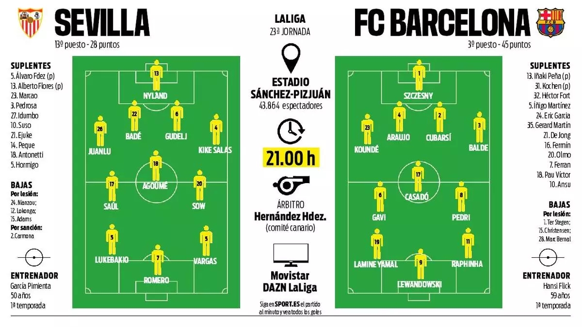 2月9日訊 據(jù)西班牙《每日體育報(bào)》報(bào)道,巴薩將在本輪西甲聯(lián)賽中客場(chǎng)挑戰(zhàn)塞維利亞,萊萬(wàn)多夫斯基和加維將回到首發(fā)陣容中。