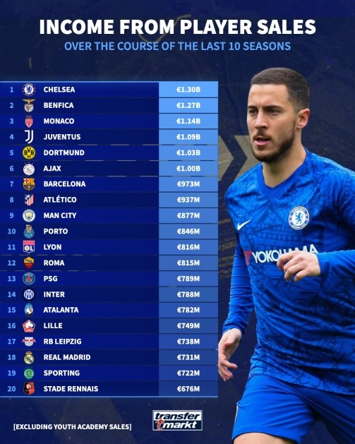 2月9日訊 德國轉(zhuǎn)會(huì)市場統(tǒng)計(jì)了近10個(gè)賽季各俱樂部出售球員所得收入的排名,切爾西通過賣球員賺到13億歐元轉(zhuǎn)會(huì)費(fèi),排名第一。