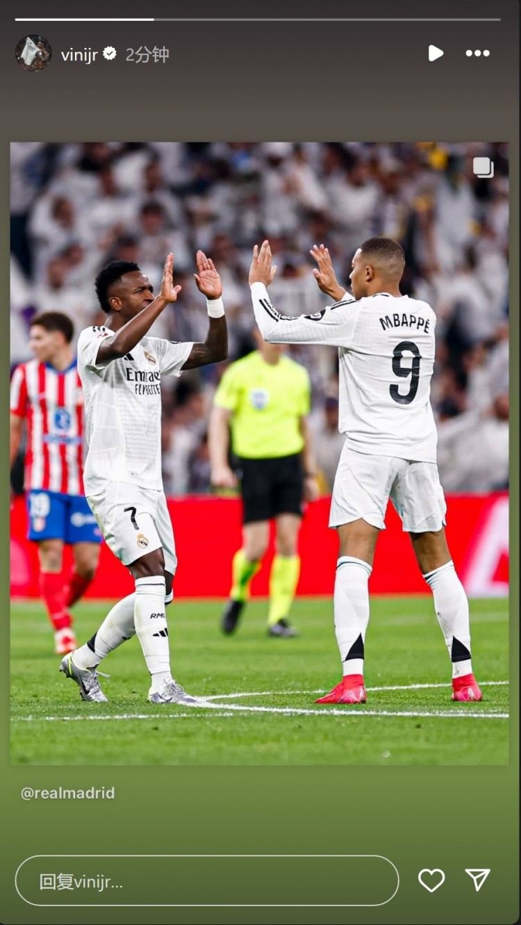 2月9日訊 西甲第23輪比賽,姆巴佩破門,皇馬主場(chǎng)1-1戰(zhàn)平馬競(jìng)。維尼修斯更新社媒動(dòng)態(tài),曬出與姆巴佩擊掌慶祝進(jìn)球的照片。北京時(shí)間2月12日凌晨,皇馬將在歐冠淘汰賽附加賽首回合比賽中客場(chǎng)對(duì)陣曼城。 本文標(biāo)簽: 足球 西甲 皇家馬德里 姆巴佩