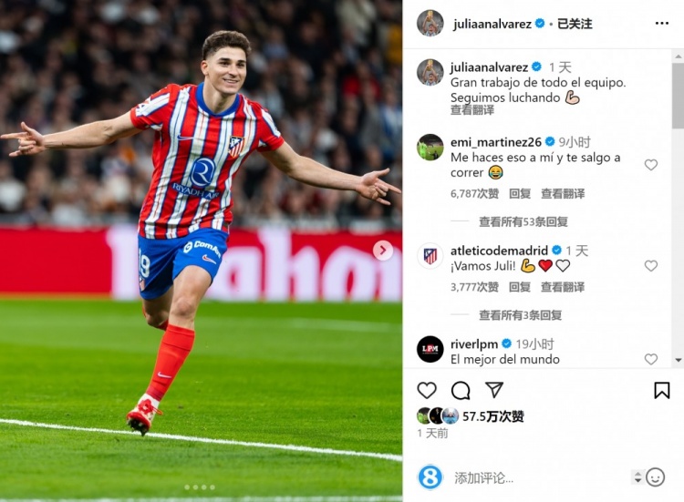 阿爾瓦雷斯社媒曬照,阿根廷門將大馬丁留言調(diào)侃道:“如果你敢這樣對(duì)我,我會(huì)追著你跑?!?/p>