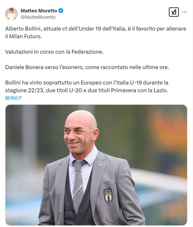2月10日訊 據(jù)記者莫雷托透露,意大利U19青年隊主帥博里尼是米蘭未來隊新帥熱門人選。根據(jù)媒體的報道,米蘭未來隊主帥博內(nèi)拉即將被解雇。莫雷托指出,意大利U19青年隊現(xiàn)任主帥博里尼是接手米蘭未來隊的熱門人選,他正與意大利足協(xié)評估未來。博里尼是一位58歲的意大利教練,曾擔(dān)任薩勒尼塔納、摩德納主帥,帶領(lǐng)意大利青年隊贏得2023年U19歐洲杯冠軍。 本文標(biāo)簽: 足球 意甲 AC米蘭