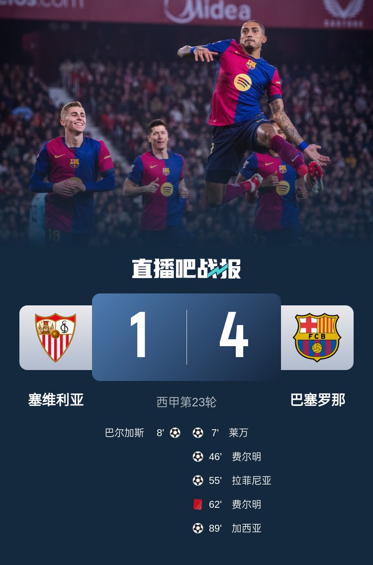 西甲第23輪,巴薩4-1塞維,距離榜首僅差2分。上半場,萊萬墊射破門,巴爾加斯1分鐘后迅速扳平,阿勞霍被鏟傷退;下半場,費(fèi)爾明頭球,拉菲尼亞再下一城,費(fèi)爾明紅牌,補(bǔ)時(shí)前埃里克-加西亞再進(jìn)一球。