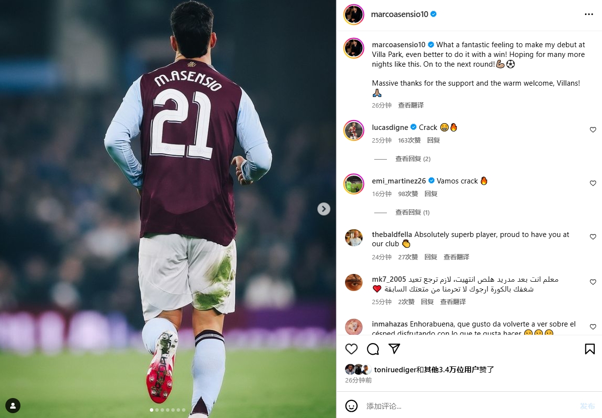 他也在賽后通過(guò)社媒曬出自己的比賽照,并配文:“在維拉公園的首次亮相真是太棒了,取得勝利讓這感覺(jué)更好了!期待未來(lái)能有更多這樣的夜晚。晉級(jí)下一輪!??????????非常感謝你們的支持和熱烈歡迎,維拉球迷們!”