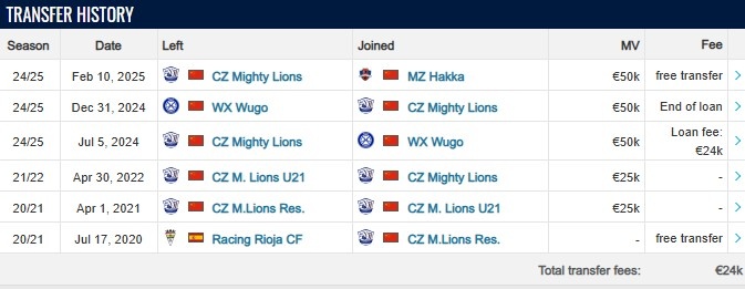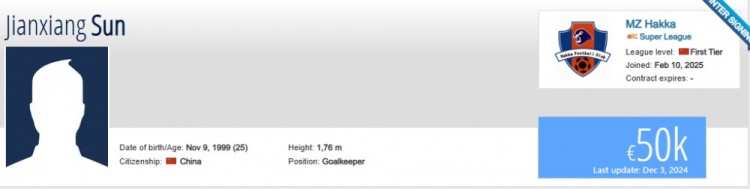 德轉(zhuǎn)顯示,孫健祥于2025年2月10日正式和梅州客家簽約,雙方合同薪資和年限沒有公布,目前球員德轉(zhuǎn)身價(jià)為5萬歐元。