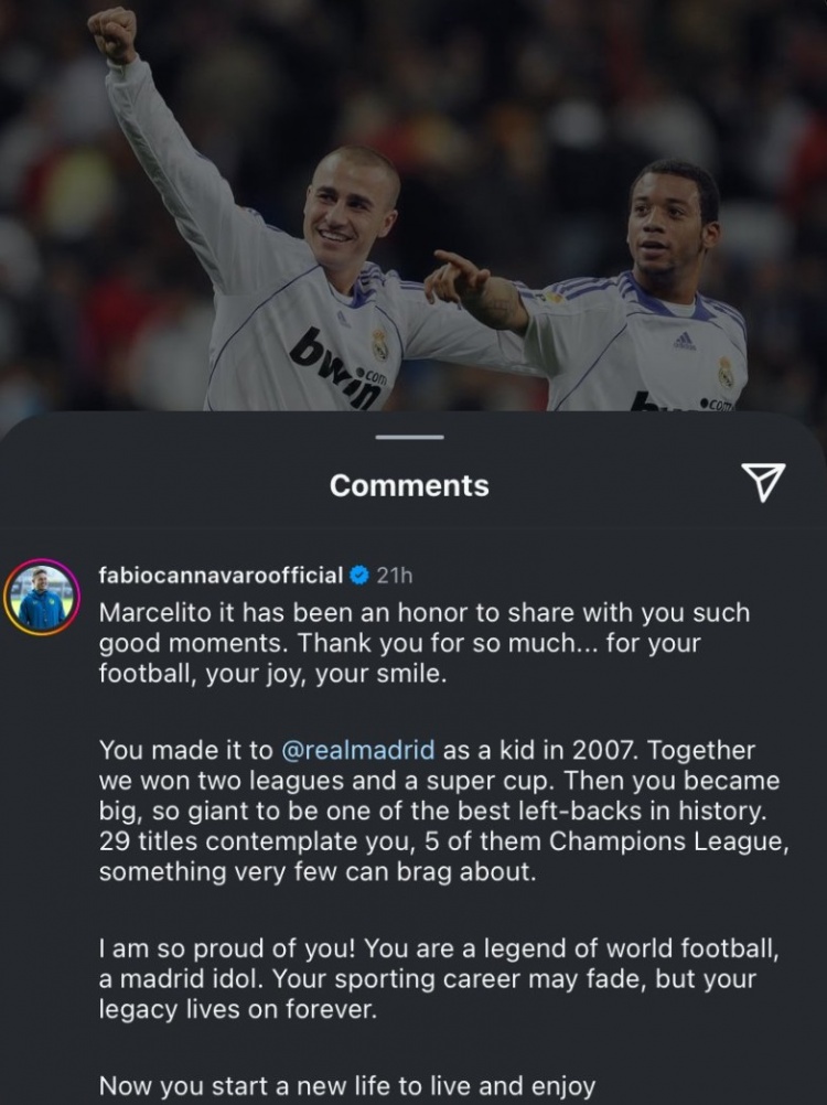 卡納瓦羅表示:“小馬塞洛,能榮幸能夠和你共享一段美好時(shí)光。非常感謝你的足球技術(shù)以及你的快樂(lè)感染力。你在2007年加盟皇馬時(shí)還是一個(gè)孩子,我們共同贏得了2座西甲和一座西超杯。而自那之后,你成長(zhǎng)為了足壇歷史最佳左后衛(wèi)之一?!?/p>