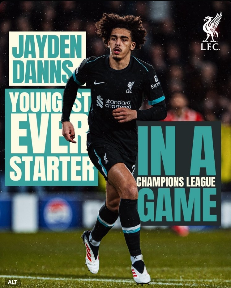 本場比賽19歲小將丹斯首發(fā)出任中鋒,他也成為利物浦隊史在歐冠首發(fā)出戰(zhàn)最年輕球員。
