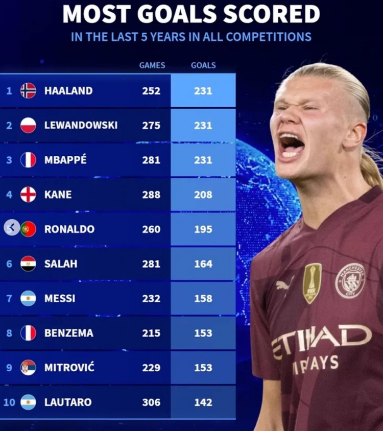 2月11日訊 《轉(zhuǎn)會市場》統(tǒng)計了近5年各項賽事總進球情況,三人并列居首。