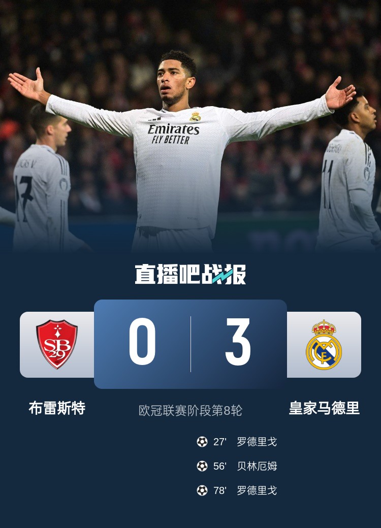 皇馬在摸林3-0擊敗布雷斯特,兩隊(duì)均進(jìn)入附加賽,羅德里戈雙響,貝林進(jìn)球。