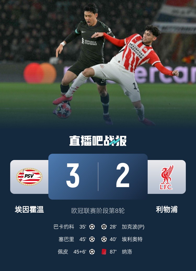 無緣全勝!利物浦2-3埃因霍溫仍頭名晉級16強(qiáng) 加克波埃利奧特破門