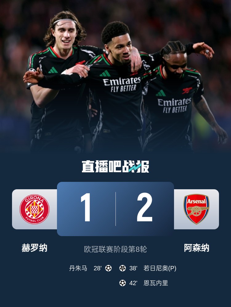阿森納2-1擊敗赫羅納,他們以第三名結(jié)束歐冠聯(lián)賽階段。