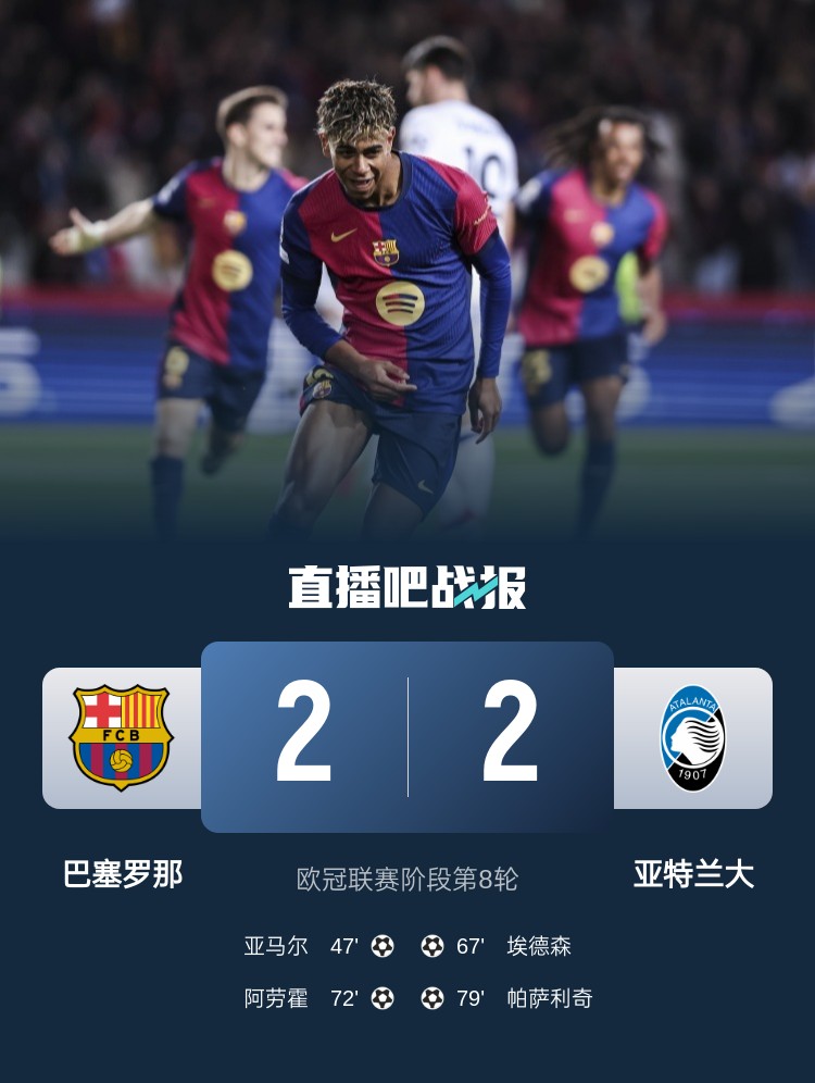 巴薩2-2戰(zhàn)平亞特蘭大,亞馬爾和阿勞霍破門,巴薩以聯(lián)賽階段第二名的成績收官。