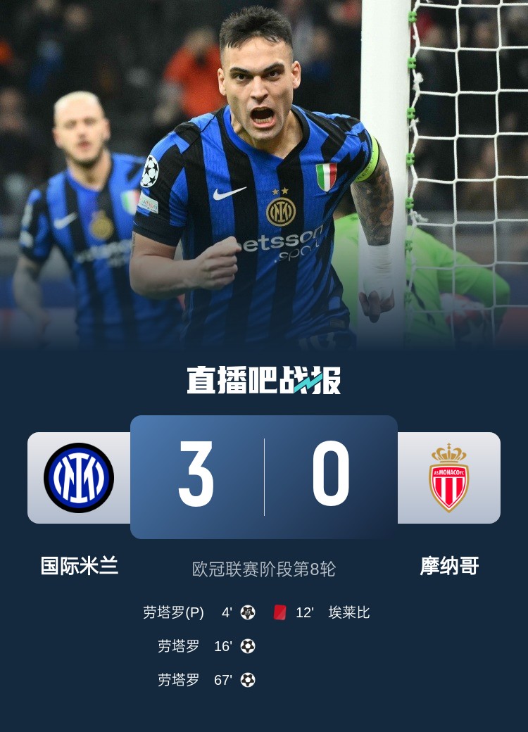 國米末輪3-0完勝摩納哥,勞塔羅戴帽!藍(lán)黑軍團(tuán)以第四名收官。