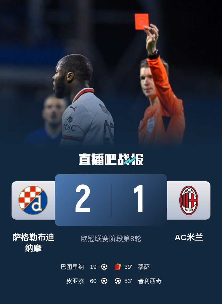 米蘭1-2不敵薩格勒布迪納摩,無緣直通歐冠16強(qiáng)。本場穆薩上半場染紅,成為比賽的一個(gè)關(guān)鍵節(jié)點(diǎn)。